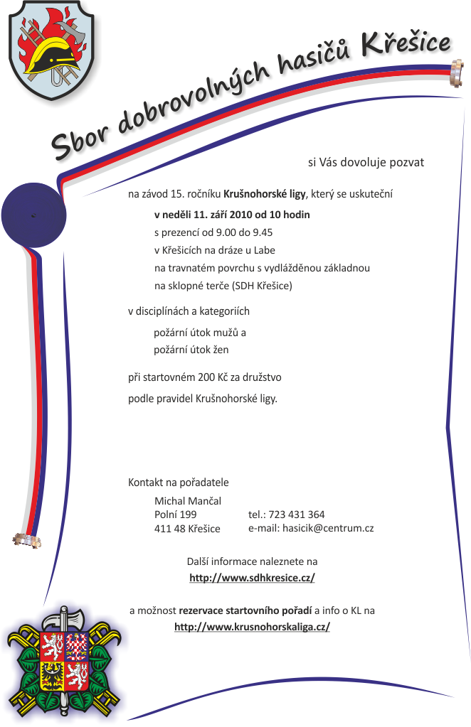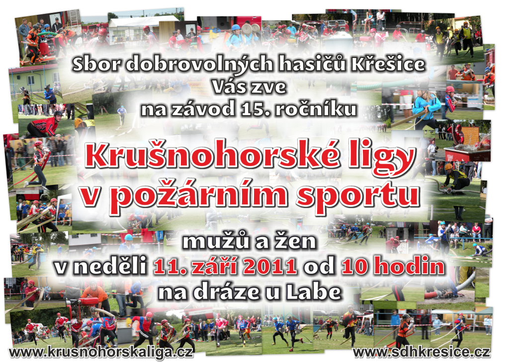 Srdečně zveme všechna sportovní družstva a příznivce hasičského sportu na neděli 11. září 2011 od 10 hodin do Křešic na sportovní dráhu k Labi kde se uskuteční další kolo 15. ročníku Krušnohorské ligy.